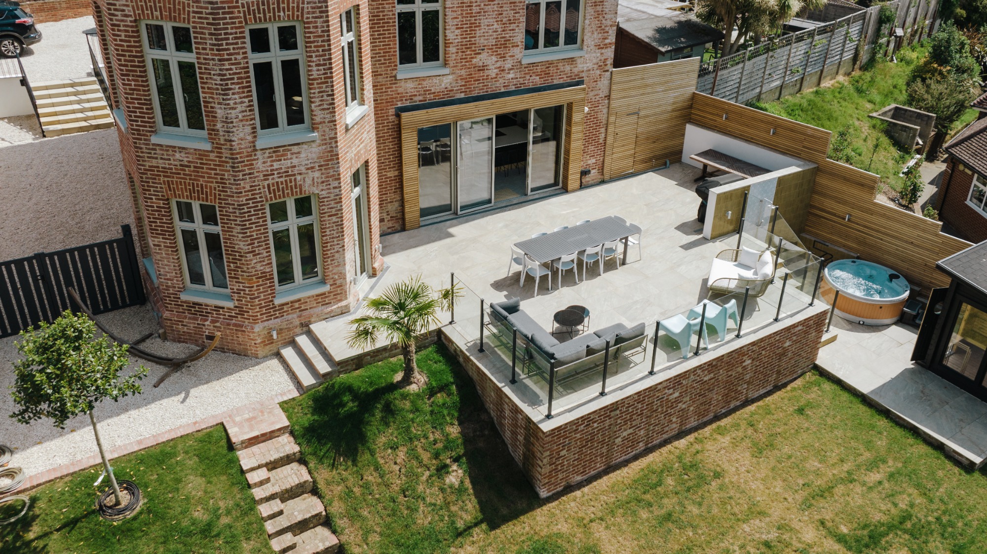 Step outside to a spacious patio with a hot tub, sauna, and garden seating for relaxing and unwinding. The outdoor area is designed for entertaining, with space for al fresco dining, evening drinks, and sunset gatherings. Sea glimpses and Totland Bay sunsets make this the perfect setting for memorable nights under the stars.