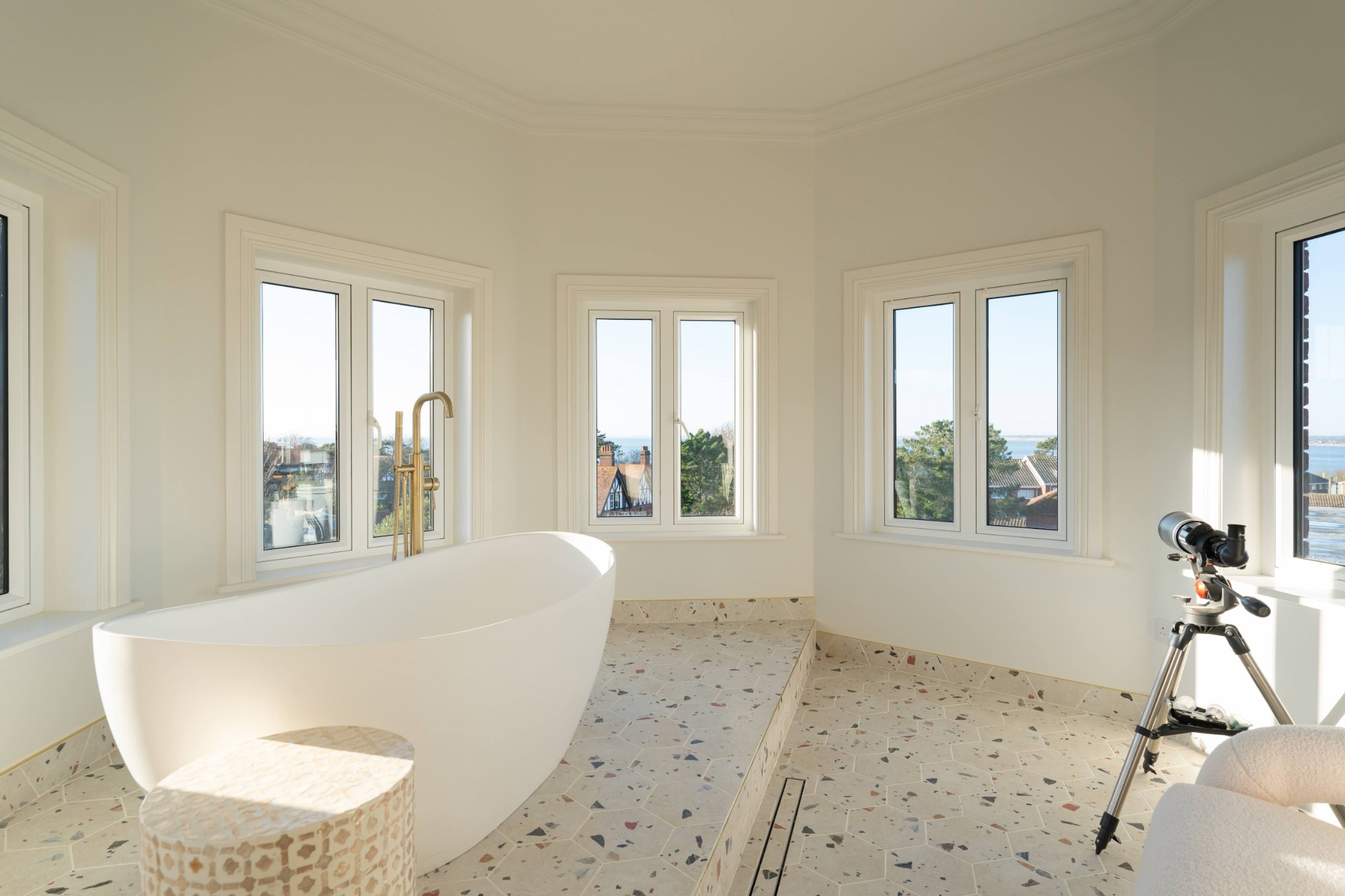 The dedicated media room on the ground floor is a wonderful spot to watch movies together or challenge a friend to beat your score on the retro arcade machine. Upstairs, guests will find a further living space complete with comfortable sofas, a log burner, TV, and a separate bar area; all benefiting from panoramic sea views from the turret.